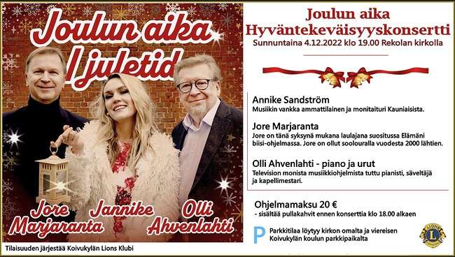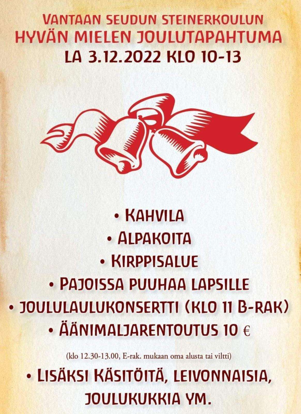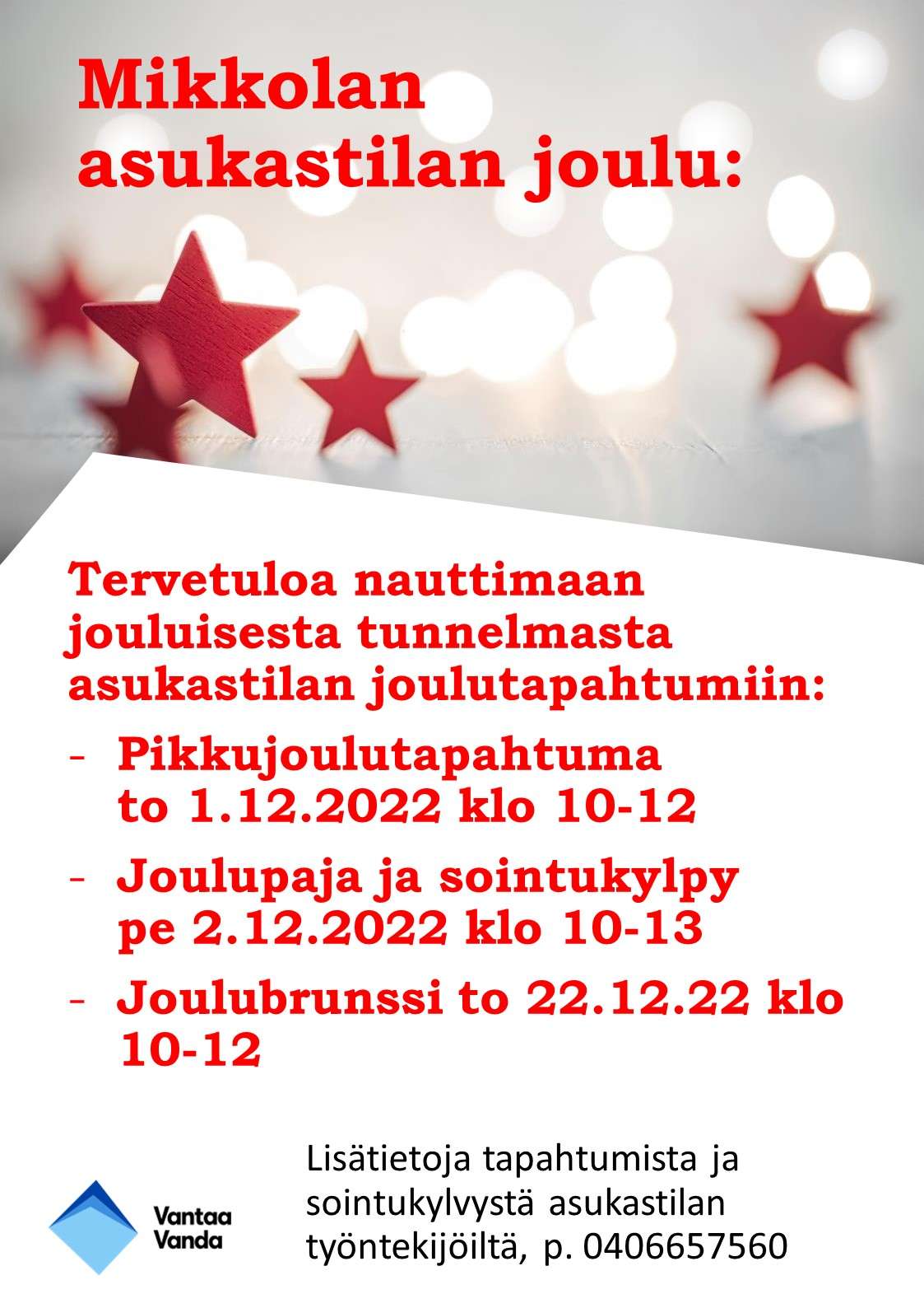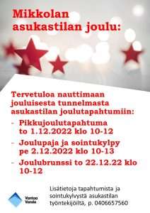 Tervetuloa Vantaan kaupungin Mikkolan asukastilan maksuttomaan pikkujoulujuhlaan nauttimaan jouluisia herkkuja ja kuulemaan jouluisia säveliä! Asukastilat ovat kaikille avoimia, kaikesta syrjinnästä vapaita olohuoneita jonne voi tulla viettämään aikaa yhdessä. Tarjoamme jouluisen aamupalan klo 10-12. Asukastila on avoinna klo 9-13. Halutessasi voit pukeutua jouluiseen asuun! Tilaisuus on kaikille avoin ja ilmainen. Osoite: Mikkolan koulu, Lyyra-rakennus, Lyyranpolku 2, […]